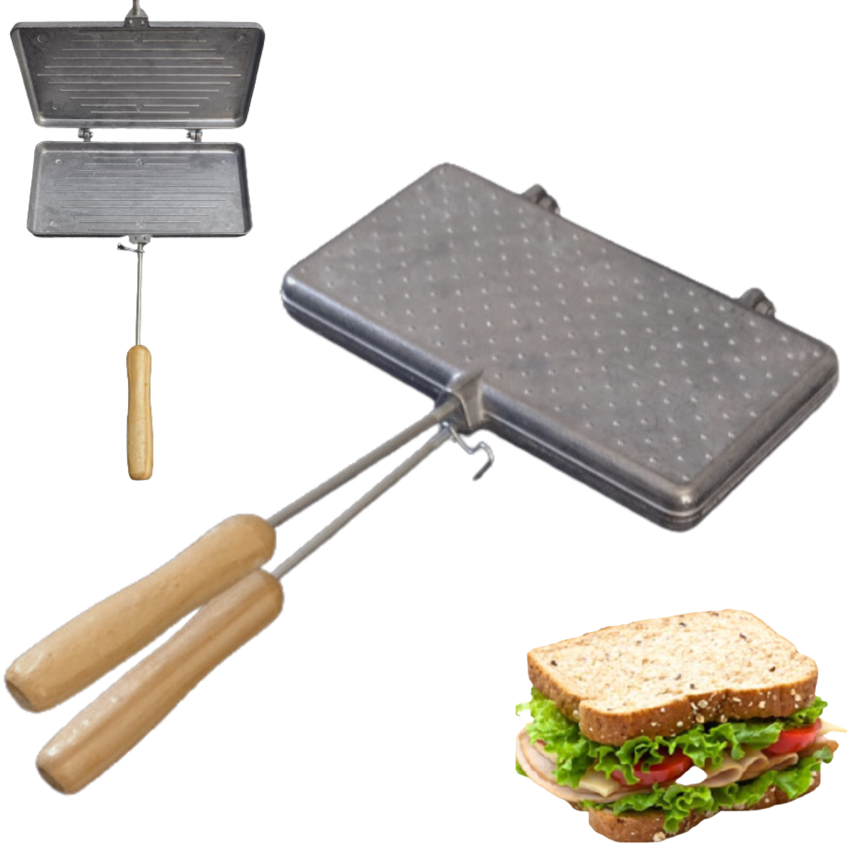 A Forma Para Baurutex Sanduicheira Dupla Com Cabo De Madeira  é uma chapa de alumínio com cabo de madeira projetada para uso em fogões a gás.